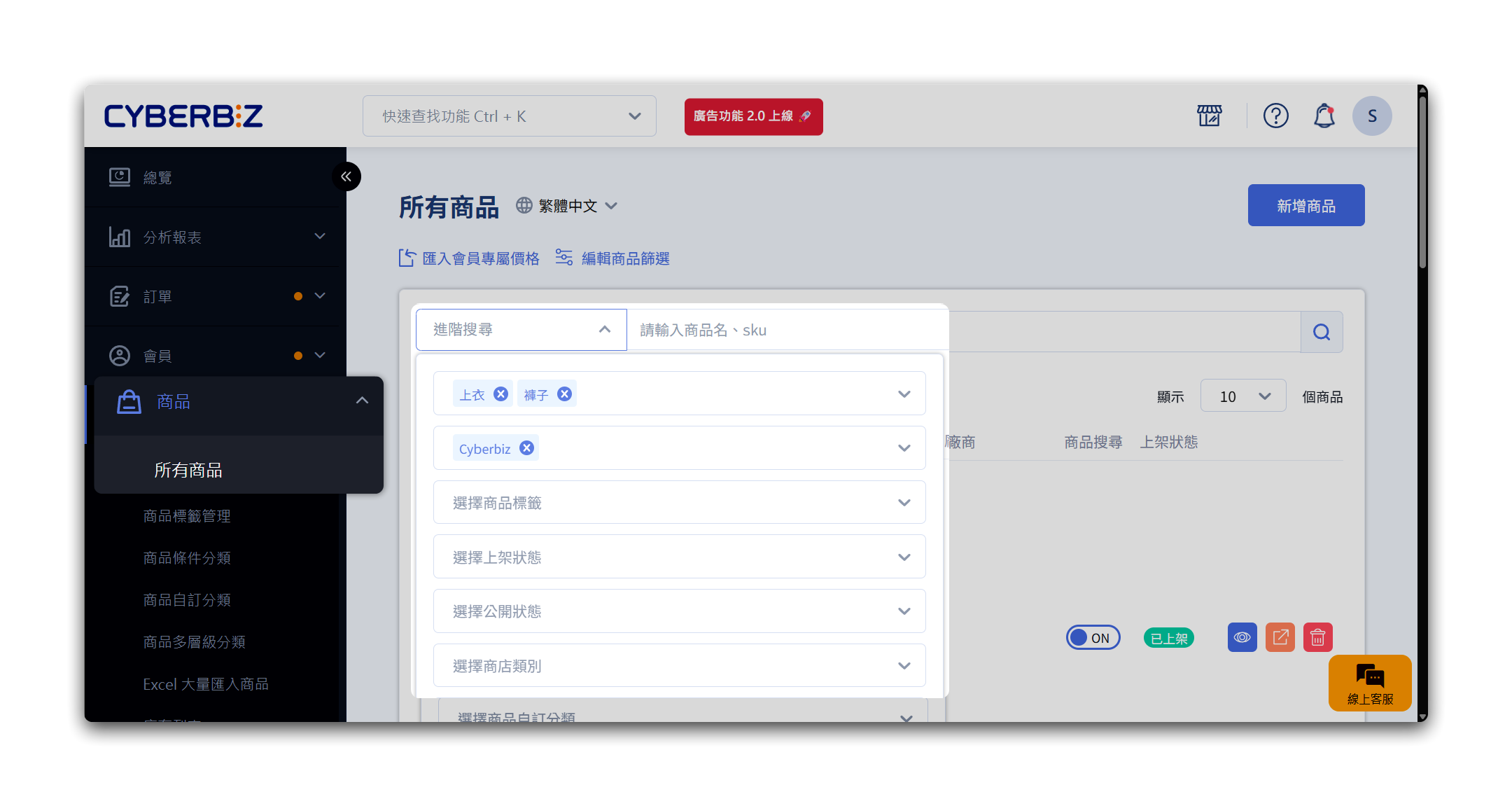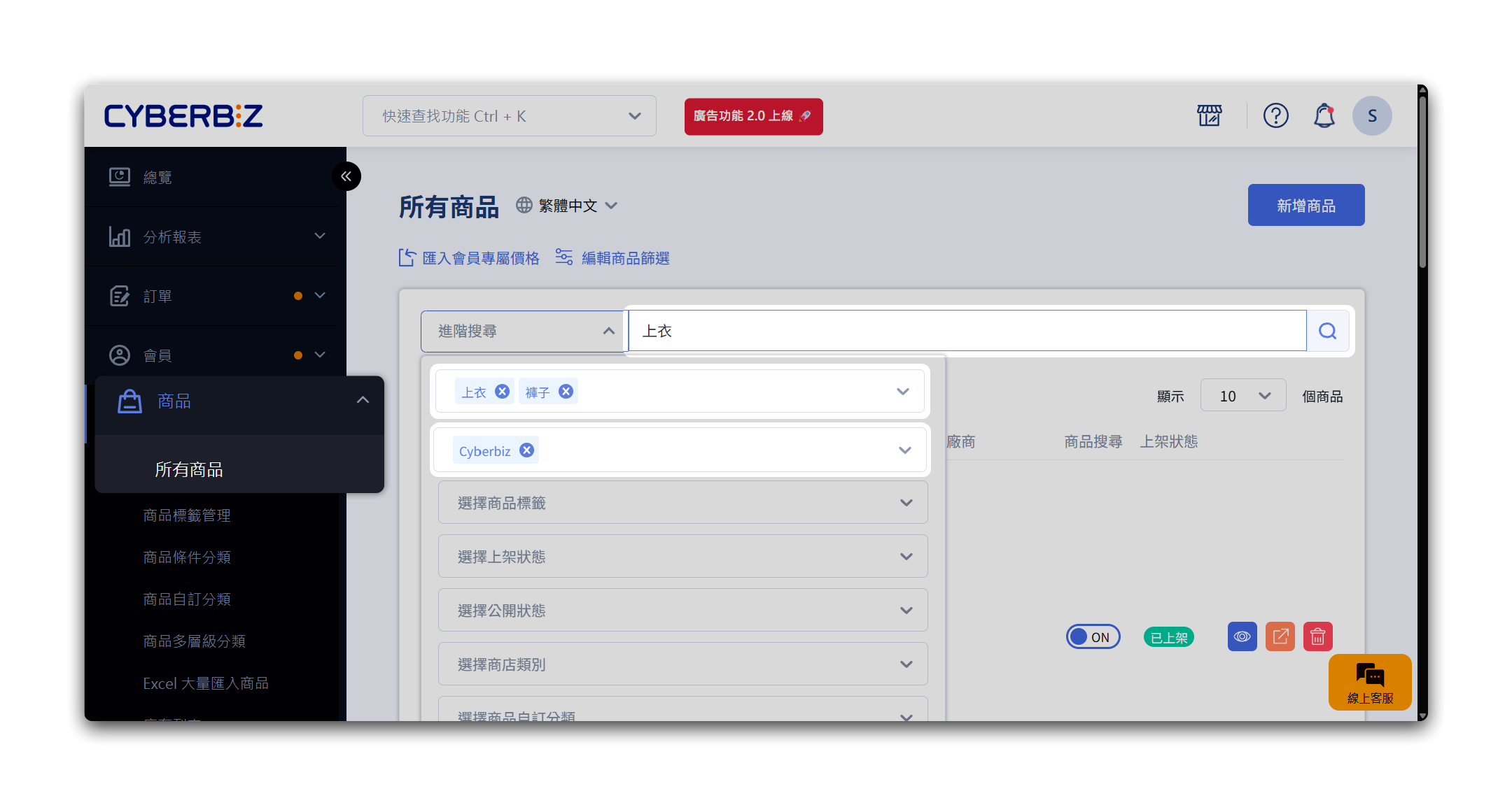 在 CYBERBIZ 後台,透過關鍵字搜尋與多重條件篩選,可快速找到目標商品,支援商品管理、價格調整、庫存更新、促銷活動設置及報表分析等後台操作。 此功能可協助商家高效管理商品庫存與編輯流程,提升後台操作效率與精準度。