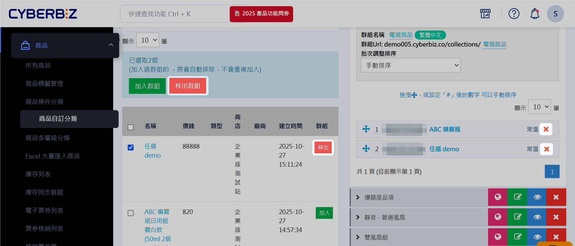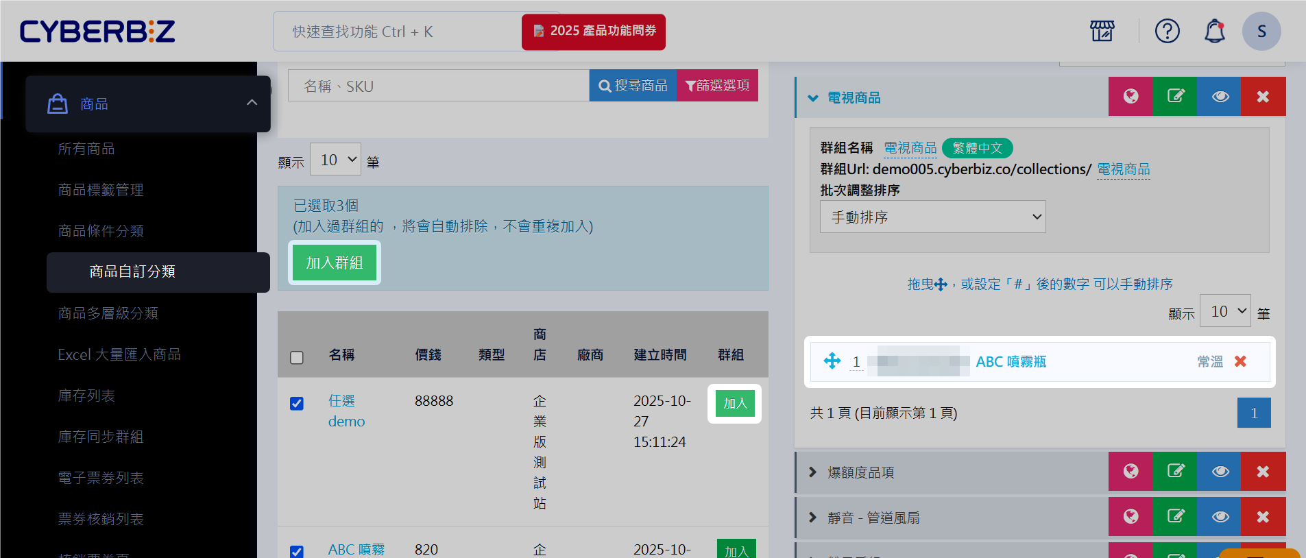 - 商品歸類與頁面優化:手動勾選商品,將其歸類至自訂分類,使商店頁面更整齊,提升消費者查找商品的便利性。