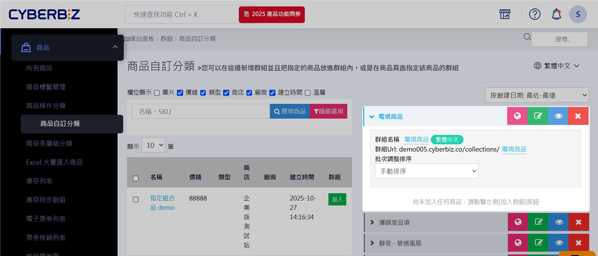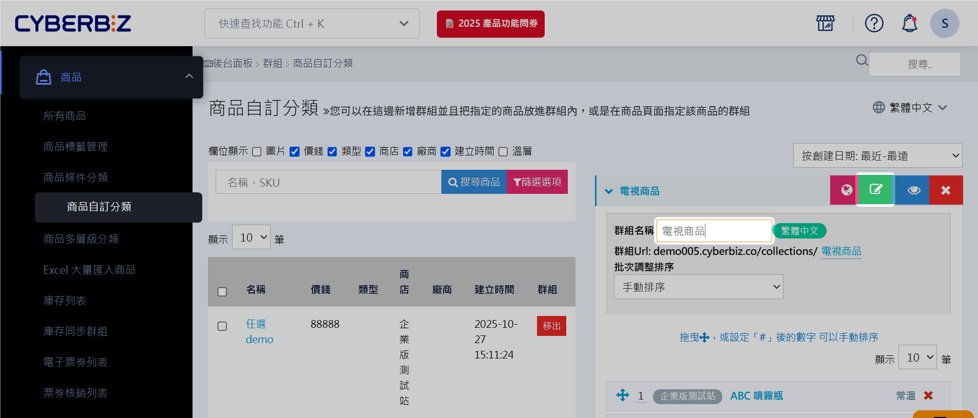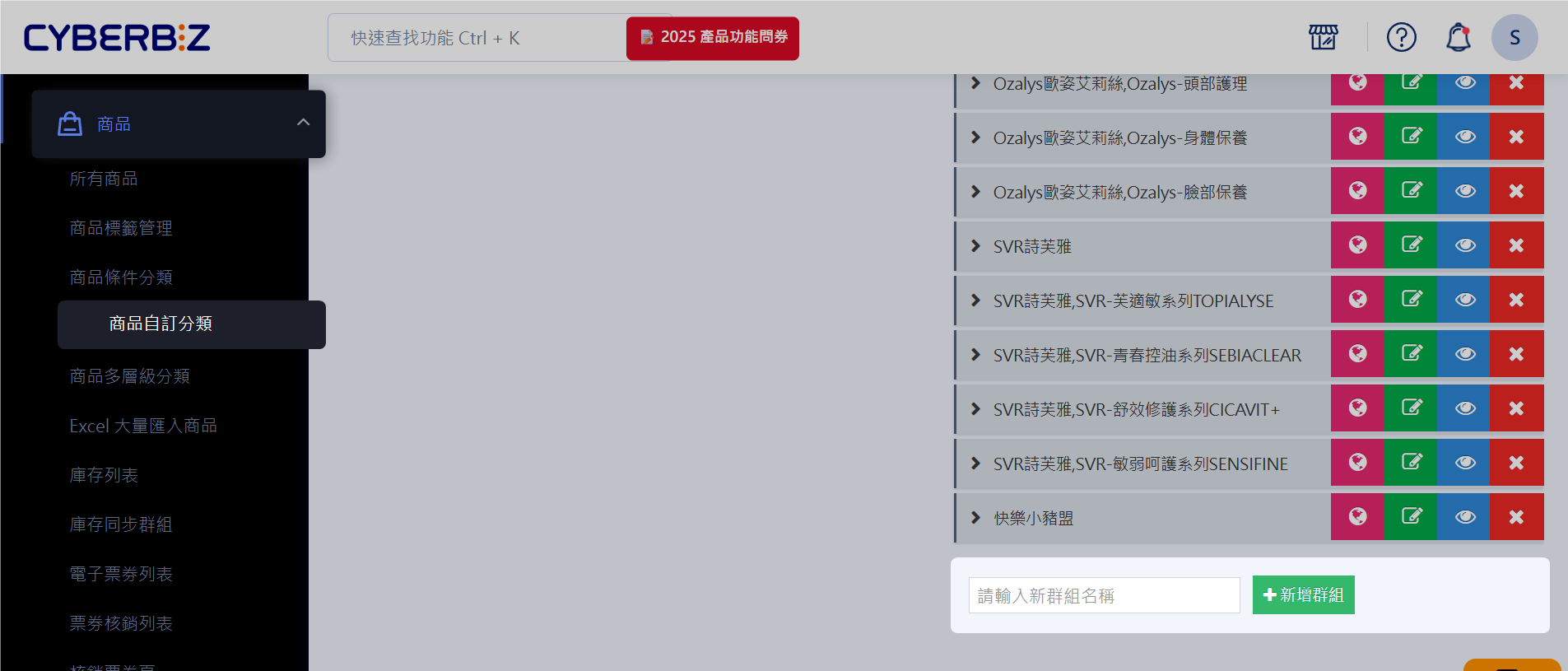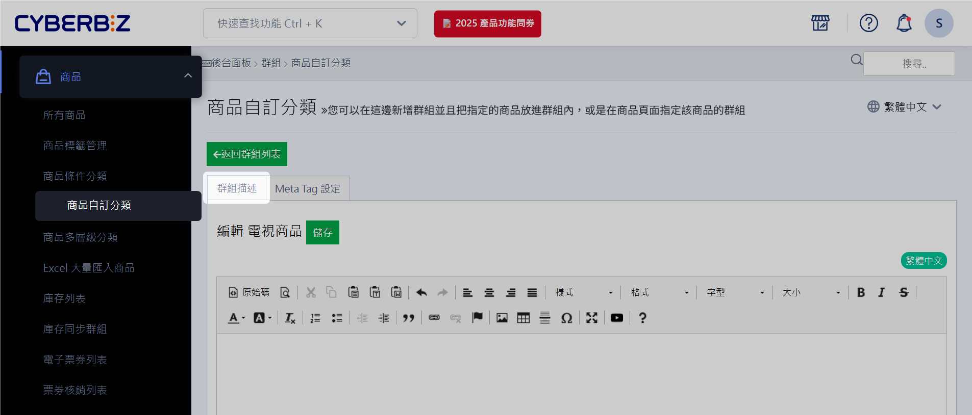 - 登入 CYBERBIZ 電商後台,前往「商品」→「商品自訂分類」。