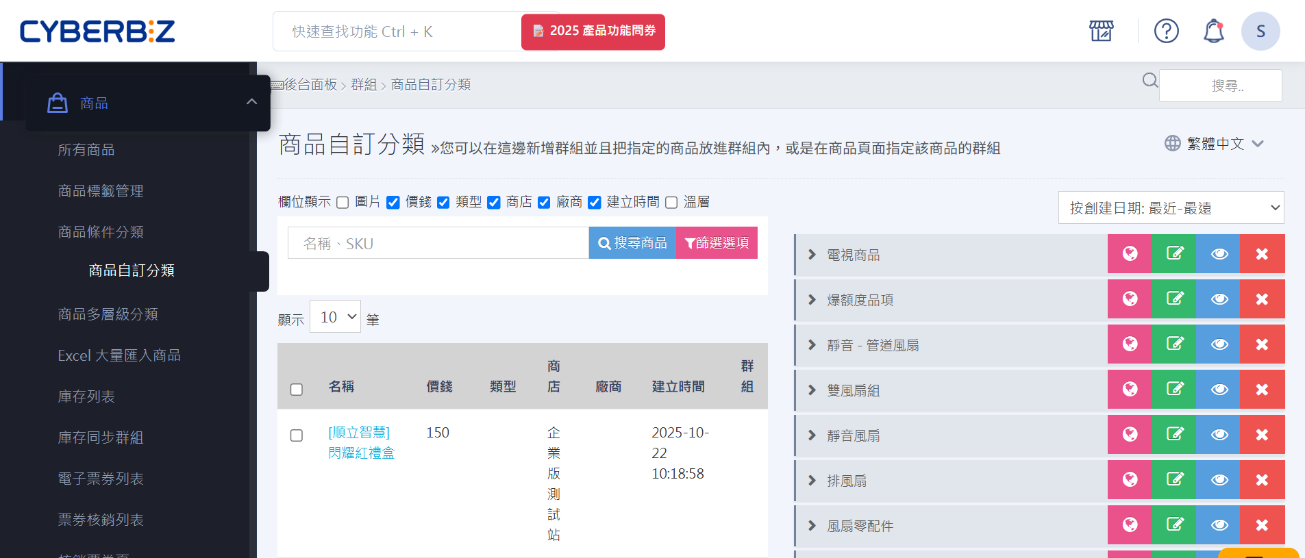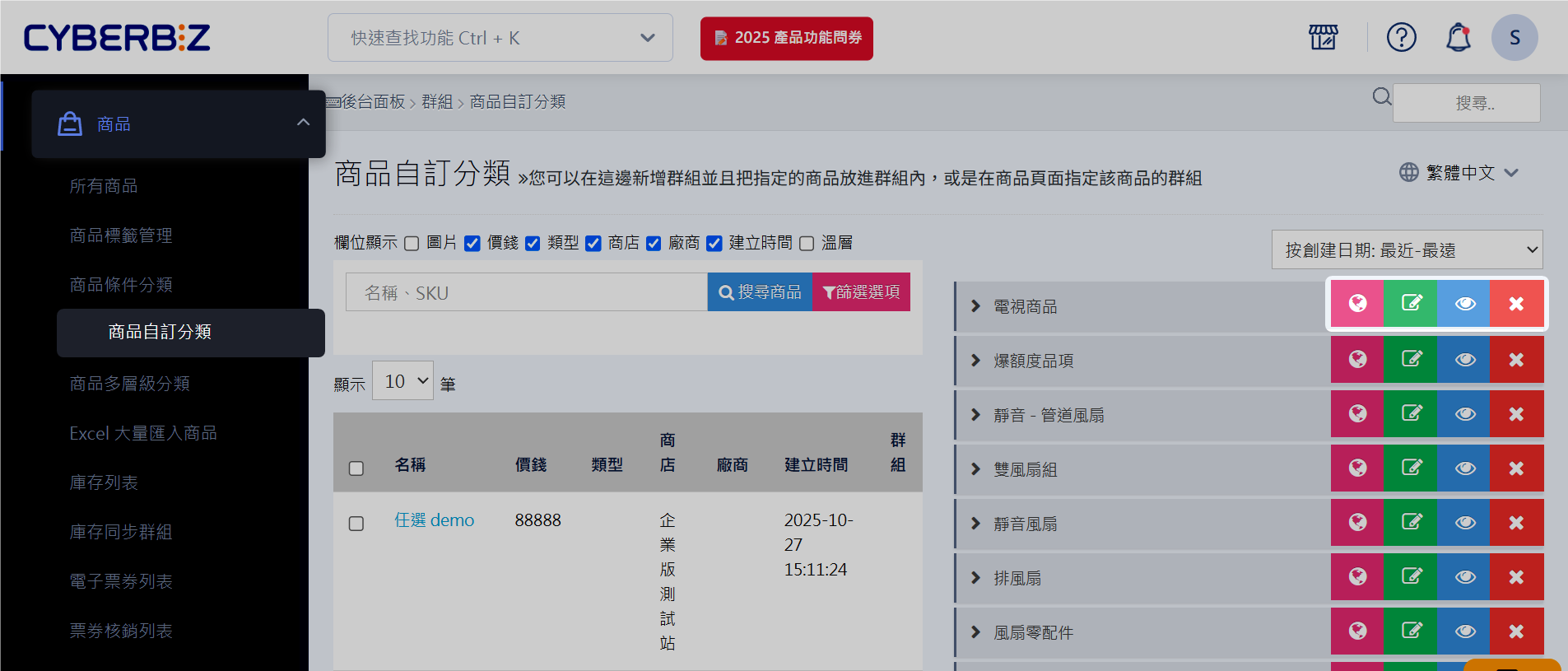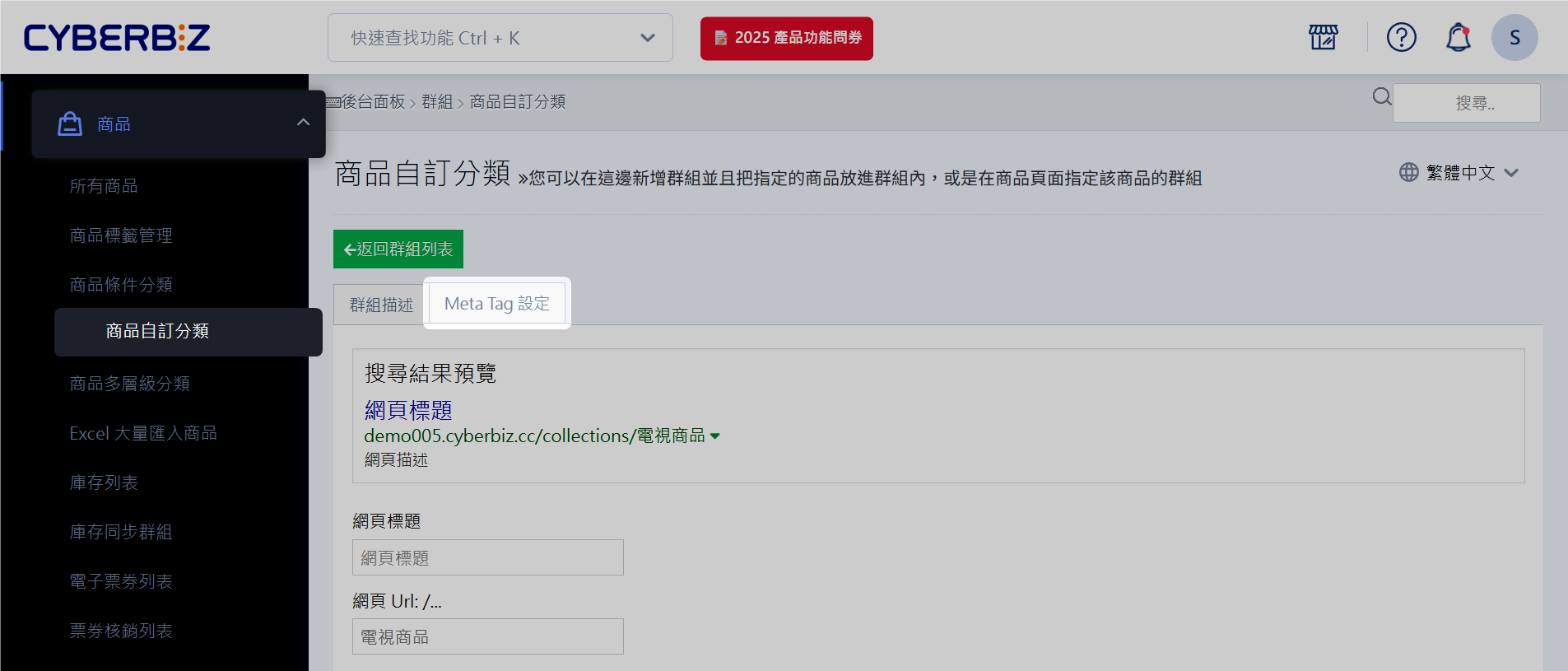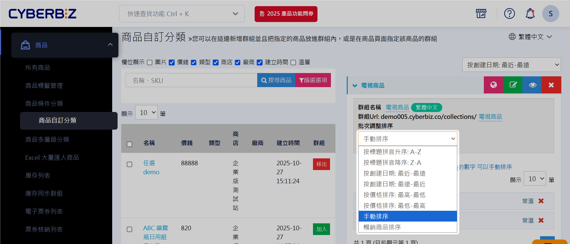 - 登入 CYBERBIZ 電商後台,前往「商品」→「商品自訂分類」。