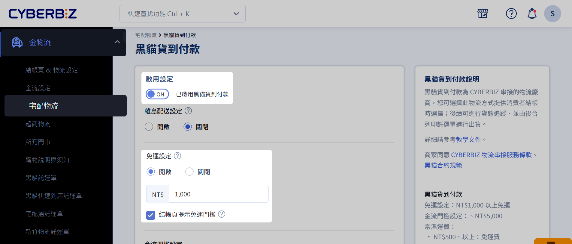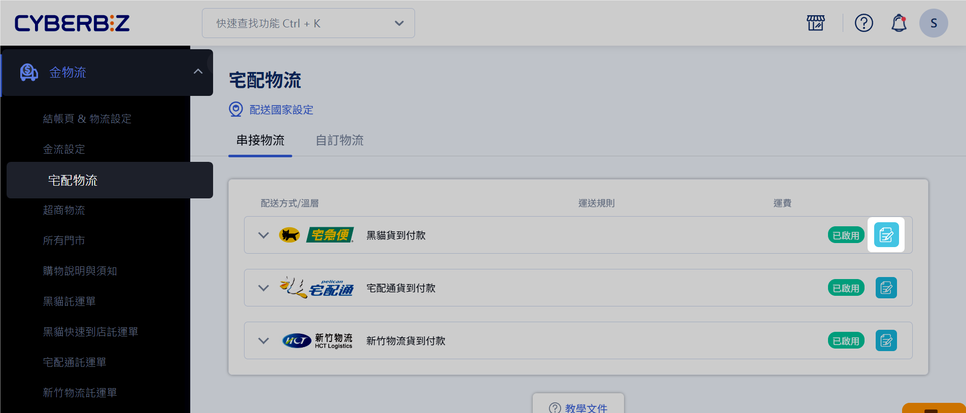 - 登入 CYBERBIZ 電商後台,前往「金物流」→「宅配物流」。