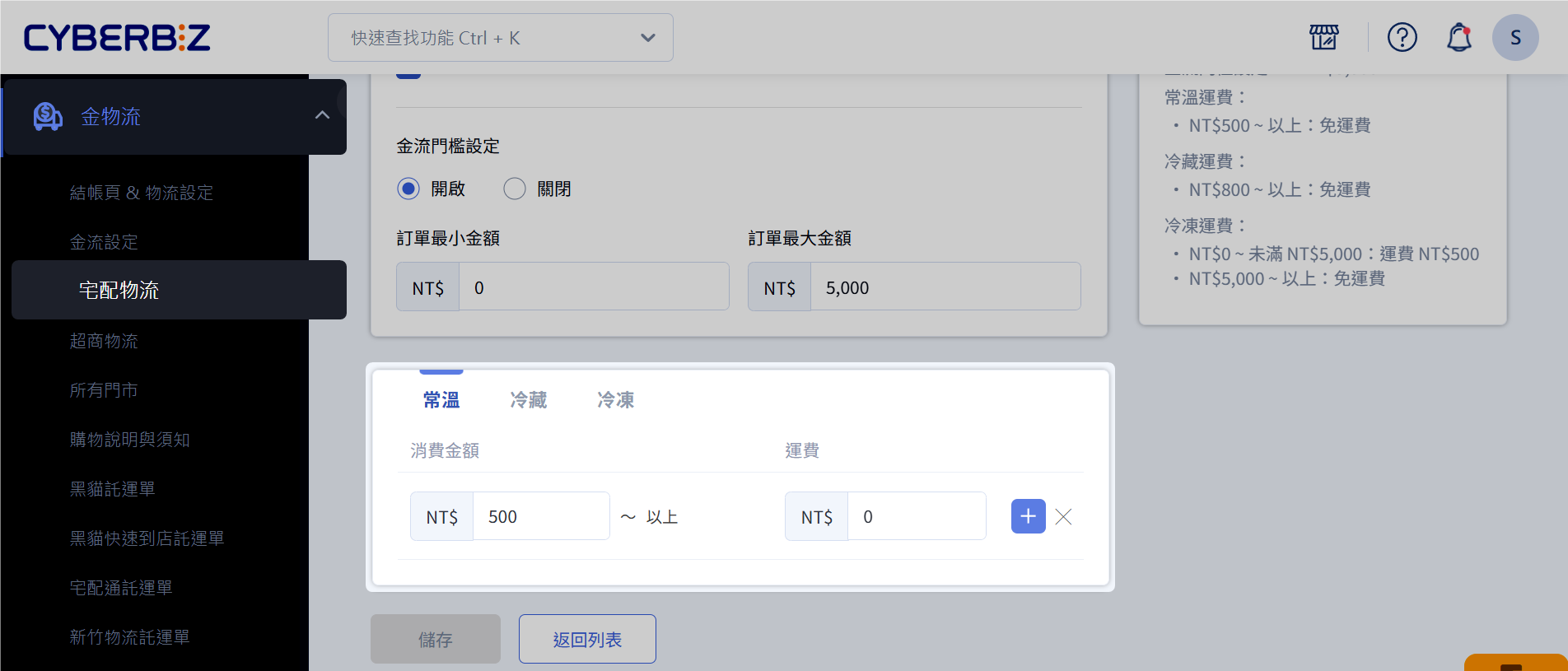 - 設定不同溫層運費(只能依代收的訂單金額作為運費標準)。
