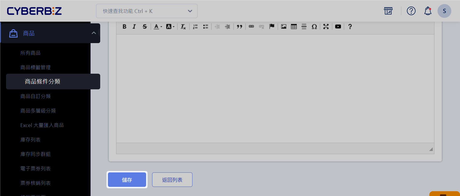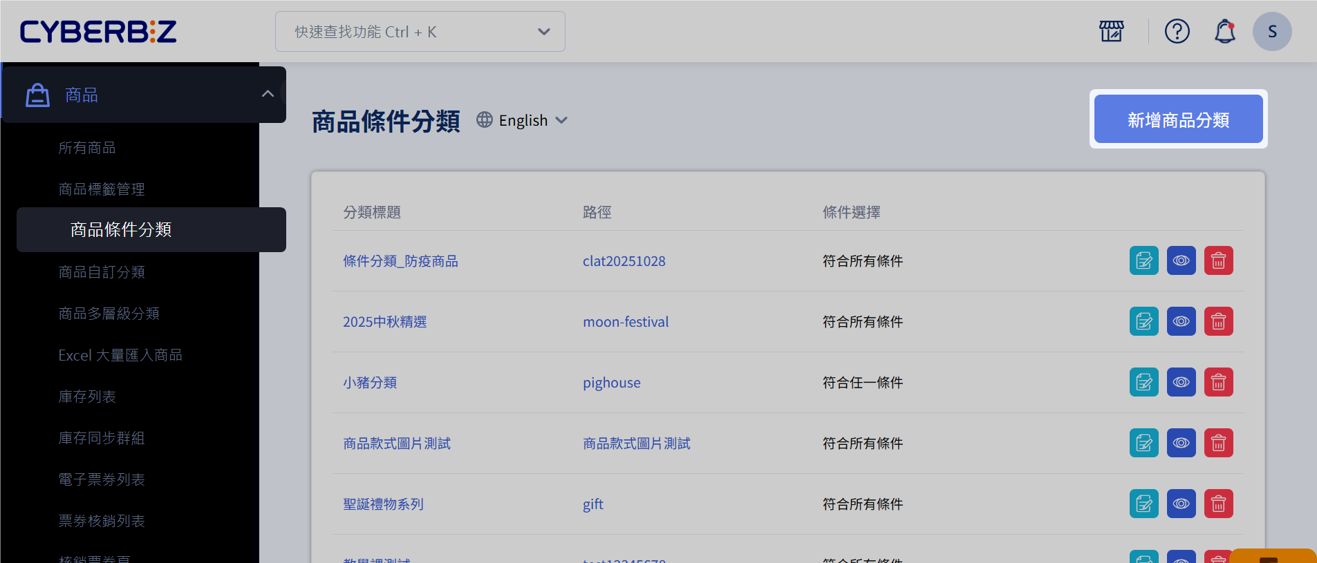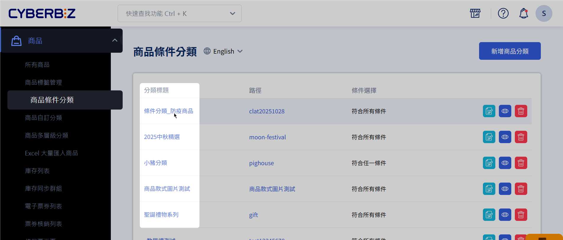 使用 POS 系統商家,若想管理商品並建立 POS 選單,請設定 POS 商品多層級分類,並建立商品自訂分類或商品類型。條件分類恕不支援 POS 系統。詳細操作可洽 POS前台選單設定。