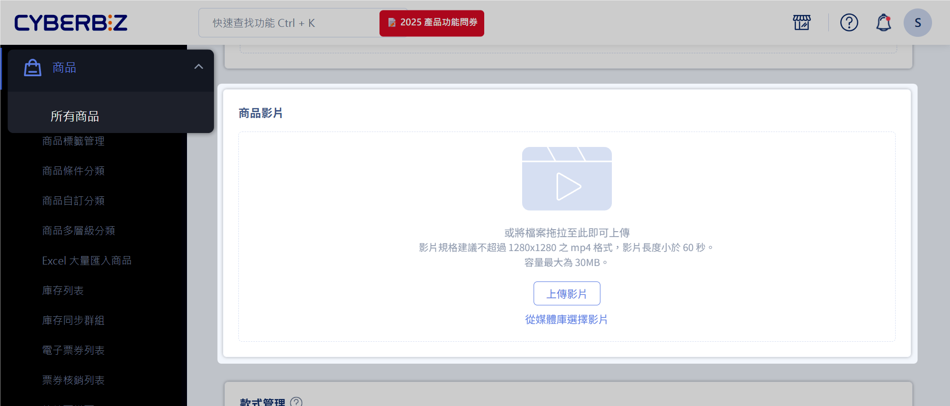 - 在商品影片區塊點擊 上傳 按鈕,選擇本機影片檔案。